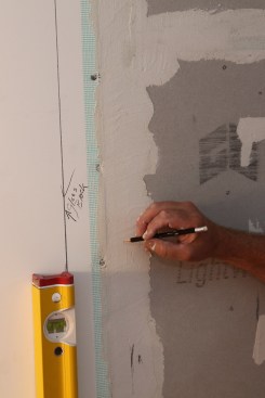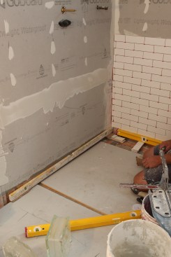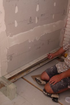 The shower is to receive a glass-block wall, so here the crew member draws a plumb line at the location of the wall.