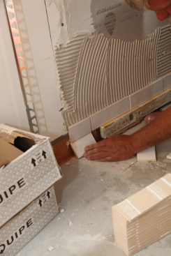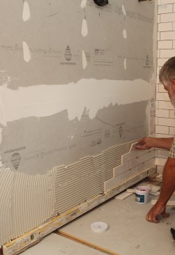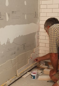 For this wall, the crew member begins the installation in the corner, alternating full and half tiles to establish the stair-step pattern. Again, he uses plastic wedges to set the width of the horizontal grout lines.
