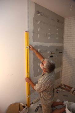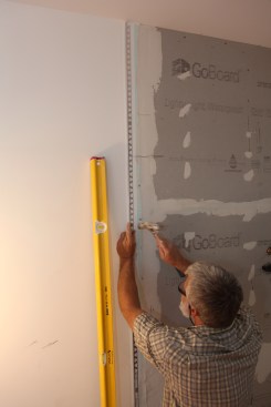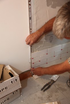Metal edging completes the tile on this wall of the shower. After completing the four courses over to the layout line, the crew member inserts metal edging behind the tile.