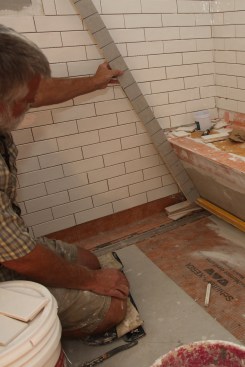 The courses for the angled face of the shower seat won’t match up evenly with the adjacent wall. The crew member uses the story board to set the ledger giving him a full course under the shower seat.