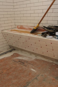 He finishes the shower seat face, leaving the bottom courses out until the floor tile is done.