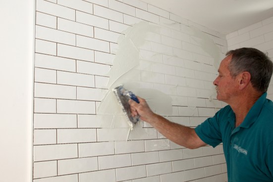 Using a rubber-edge grout trowel, the author applies the grout to the wall in diagonal strokes, which work better to fill the joints between the tiles.