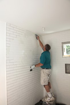Standing on a short step, the author makes sure that all the joints are completely filled, right up to the ceiling. He is able to work this entire wall at one time, spreading the grout from the ceiling to the floor.