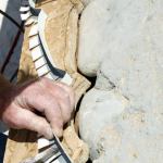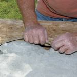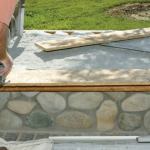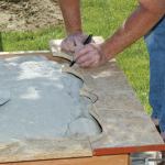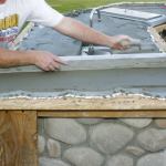 The base was made of formed concrete covered with river rock, and it featured a lower section that would serve as a serving or seating area. I decided to bond a reinforced mortar bed to the base and size it to overhang the base by a few inches; this — in lieu of a toekick — would make the top more comfortable to use. I also wanted the top’s edge to match the undulations of the rock base.