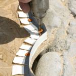The process I used to set the Chinese slate tiles was a bit unusual. I began by installing the 2-by-3-inch apron tiles, which I cut from 12-inch tile stock and secured with latex thinset mortar. Some of the curves were tight enough to require a few 1×3 tiles. Once the thinset had hardened, I cut and dry-fit the 12-inch tiles, recut those affected by the porcelain inlay tiles, then installed the tiles with the perimeter tiles hanging over the edge. Three days later, when the latex thinset had hardened, I used a wet-cutting blade mounted in a wet angle grinder to trim back the tiles and shape a smooth-flowing rounded edge. I then used a series of diamond polishing discs (up to 1,500 grit) to give the edge a comfortable, easy-to-clean honed finish. I did this before grouting, to prevent scratching.