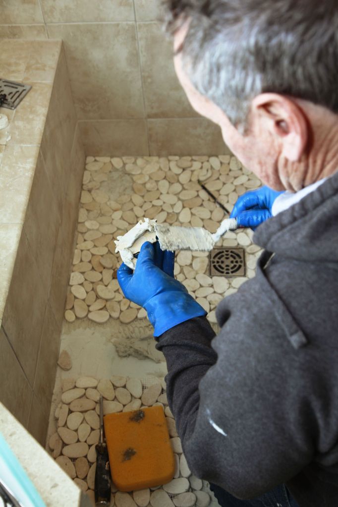 Once all the tile was in place, I pressed the stones down with a rubber grout trowel to make sure there were no high edges (below). That way, I knew the floor would be flat, with a smooth pitch to the drain.