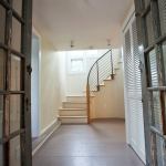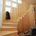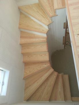 I assembled the upper winder just like the lower one, and finished up with the final, common tread at the upper landing. With the stair completely assembled, I shimmed and screwed each individual box from below to the studs and blocking in the exterior wall.