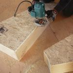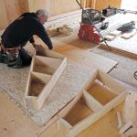 Next, I applied the sub-treads. I flipped each completed box upside-down on the AdvanTech and traced the outline with a Sharpie. I used the body of the pen to offset the line and allow for a small overhang, then cut the rough treads from the sheet. I set each tread in adhesive—kneeling on the box to eliminate gaps—and secured it with finish nails. It took one long day to make the eight winder boxes. The following day, with the adhesive dried, I routed the tops flush with the sides using a straight pattern-bit. I was ready to start stacking.