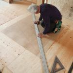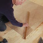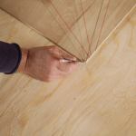 To verify the plan dimensions, I began by marking out the stair’s overall footprint directly on the floor. I checked it for square and then used a laser to plumb the corners up to the second-floor joists. I also confirmed there would be no need to adjust the total rise because of out-of-level framing. Next, I drew a full-size winder plan on 1/4-inch plywood. Mark’s drawing indicated that each winder occupied a square 4 feet 3 1/2 inches on a side. I made a cut at 4 feet 4 inches (adding 1/2 inch to allow for drywall build-out on the wall) and squared off my template with a 4-inch-wide strip fastened to one of the long sides.