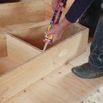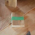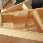 To cut and assemble the box pieces, I tack-nailed temporary stops along the front and rear offset lines on the winder template. The stops made it easy to accurately mark the cut lines in place without measuring, and provided a direct visual of the end-cut angles. They also held the boxes to a tight uniformity, which would be vital to final stair assembly. I used PL-Premium adhesive for all joints. To avoid splitting the plywood laminations, I used 2 1/4-inch 18-gauge finish nails and trusted the adhesive to provide a strong, permanent bond. With the four basic sides of a box completed, I then added intermediate bracing at 18-inch intervals to ensure a stiff tread surface.