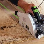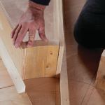 I installed painted pine risers and, as a detail, let their ends project about 1/8inch beyond the finish wall plane. Using the same 1×8 southern yellow pine that was installed on the upstairs floor, I cut tapered lengths, three pieces per tread, and joined them with wood glue and biscuits. I’d considered using a taper-jig on the table saw to cut these pieces, but rejected that idea in favor of using my Festool track saw. This quickly produced accurate, glue-ready edges and also made short work of cutting the glued-up tread blanks to their scribed outlines.