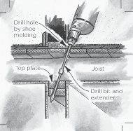 C. By removing the shoe molding at the edge of a carpeted room, you can drill an inconspicuous hole through the floor.