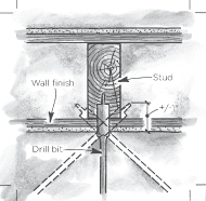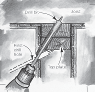 E. To run a wire across a stud or joist, drill three times, using the same entry hole: one straight in and one each at a tight angle into each bay