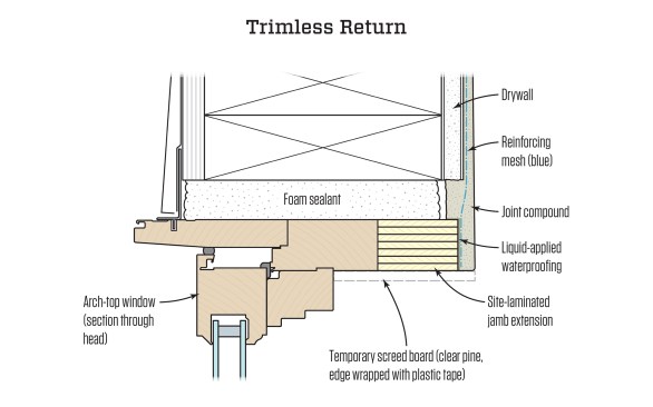Last summer, the homeowners of a project we were trying to wrap up made a request for a “simple, plaster look” on a pair of small, arch-top windows in their newly renovated second-story bathroom. We had built a number of arch-top windows (and interior doors) on their remodel and finished them off with either wood trim or tile returns. But the request for plaster returns proved to be a bit of a head scratcher—how were we going to make the transition from the drywall to the window without trim?