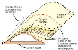 They cut dormer face profiles from 3/4-inch-thick medium-density overlay (MDO) plywood and glue-nailed them over 2x lumber blocking to create two custom sandwich “headers.” Then they stood the headers parallel to each other, 12 feet apart on the shop floor, and joined them by a series of flat 2×4 “purlins” spaced about 8 inches apart (see illustration, below). Rand cross-laminated a double layer of 3/8-inch bendable plywood over both sides of the purlins, filled the cavities between purlins with expanding urethane foam, then cut the structure into two matching, monolithic units.