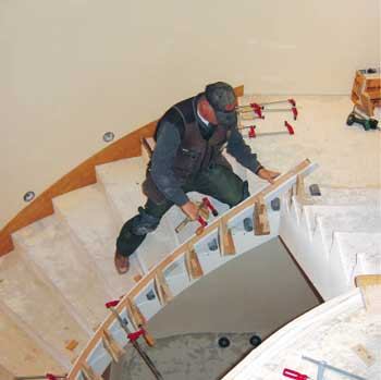 The simplest way to form a spiral rail is to clamp it along the edge of the staircase itself. When I arrived on site, the rough stairs were in place and drywall had been installed on the outside stringer.