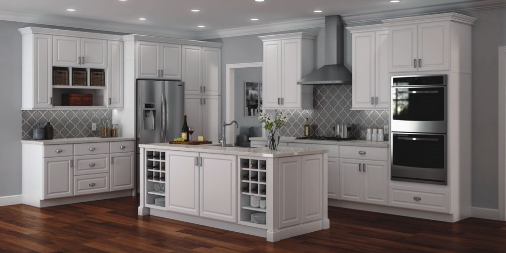 In an open plan home, you can use the same cabinets you used for your kitchen throughout the space to create a seamless look, if that’s your preference and budget allows, or mimic the look with stock cabinets.