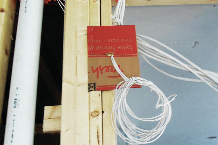 A: Andy Hannan, production manager for Mark IV Builders, in Bethesda, Md., responds: Whenever I have wires that need to come through the drywall in a certain spot, I run them out through a good-size square of corrugated cardboard stapled to the framing in the exact position of the speaker, security sensor, or other fixture that the wire is supposed to feed. The corrugated cardboard is compressible, so it can be left under the drywall, and the arrangement makes it difficult for the drywall hangers to move the wire or bury it.