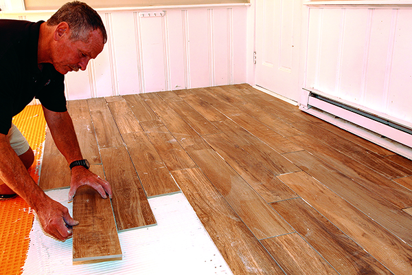 Before I mix any thinset, I scan the room to determine which sides are the most visible. That’s where I’ll begin my layout. In this case, I decided to start at the front wall of the house and the wall adjacent to the front door. To keep the installation neat and easy to handle, I always put down just a few courses at a time. To minimize lippage, I stagger the ends; for this floor, I started with a quarter of a tile, then a half tile, then a three-quarter tile, and finally, a full tile. With four starter pieces, I worked four courses at a time.