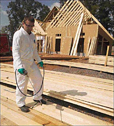 Borates applied to wood framing (above) provide one of the most effective treatments against the super-aggressive Formosan termite. Pretreated lumber is available, but typically a pest-control specialist must spray all the framing and sheathing with a borate solution at the “dried-in” stage of construction.