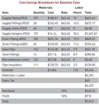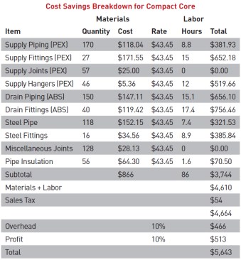 Koertzen’s Habitat houses rely on volunteer labor, so he has no information on the labor cost savings to be gained by using so much less pipe and fewer hangers. But there’s no doubt that the construction cost involved in a compact layout is less than in a widely distributed layout. Our research team analyzed that comparison for a typical mid-market house.