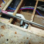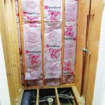 Floor framing. We demolished the original floor tile and underlayment, then cut out the subfloor in the shower areas. In both showers, we were unable to fully cut the subfloor away without also undermining adjacent partitions, so we left an inch or two of subfloor at the back of one shower and at one end of the other. Since these strips were at the edge of the enclosure, well out of the impact zone where a bather would stand, we reasoned this wouldn’t compromise the structural integrity of the base.