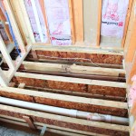 During the demo, we found that the joists in the smaller, 3×4 shower ran perpendicular to the linear drain, while in the larger, 3×5 shower they ran parallel. The TI-ProBoard has a structural ribbing and must be installed perpendicular to the framing. Its orientation to the drain is irrelevant, but in both showers, our plumber had to reconfigure the drain lines to connect the linear drains. The rough-in for the smaller shower was straightforward: Leaving the center bay open for the drain stub, we installed 2-by vertical blocking to the web of the joists of the outer bays. These verticals support horizontal blocks between the joist flanges.