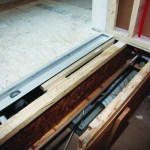 In the larger shower, where the linear drain runs parallel to the joists, the installation was a little trickier. As luck would have it, one of the existing I-joists was centered smack-dab in the middle of the new drain location. With the subfloor removed, we were able to cut out the offending joist and fish in a new one from above. Luckily, there were accessible bearing partitions in the finished basement below to pick up either end of the new joist. Now the old joist (minus a center section) supported only the drain.