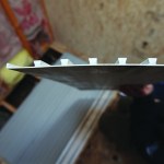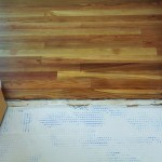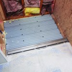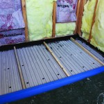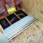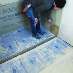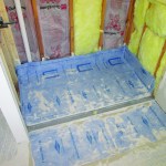 Integrating the Fin Pan. The Fin Pan TI-ProBoard structural underlayment is available in 8- and 12-foot lengths, each 12 inches wide. (It comes in a kit that includes the central drain, which we discarded.) The panels can be cut to length with any type of saw, though the Fin Pan technical reps recommended cutting it with a wet saw to limit the number of glass fibers released in the air. The narrow panels have interlocking edges that slide together—they don’t overlap. The strength of the panels comes from their ribbed profile, which interlocks with the mud base.