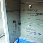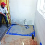 With each floor done, Jean installed Durock backerboard, double-checking as she went to make sure the drop-in tiled drain cap still had proper clearance. To complete the waterproofing in both showers, she applied an approved mesh at the seams with thinset, then began waterproofing the walls with the Laticrete 9235.