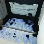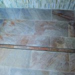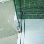 Drain cover. The drain cover comes in two styles, a standard metal top grate or a tile-in cap, and the client chose the latter. It’s a stainless steel tray with fixed metal feet that stand passively in the drain channel, making it easy to remove for occasional cleaning. The cap tray has raised edges to contain the tile, which gets installed in thinset and grouted. Outside the drain, it’s critical to install the tile dead-flush, and eliminate small surface voids that would allow water to seep under the door sweep, which acts as a kind of “squeegee” that must seal tight against the tile.