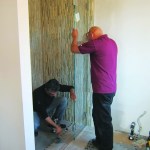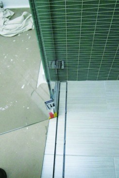 For the larger-shower walls, the client chose a rough, tessellated tile, which is geared more toward a decorative application than to a heavy-use area like a shower. This was a problematic choice, as it’s impossible to grout or to clean, and its highly irregular surface provided a poor base for mounting the clamps and hinge plates for the glass door. Because we couldn’t guarantee a proper seal at the valve escutcheon, we did persuade the client to use the same 12×24 tile being installed on the floor for the wet wall. For the small-shower walls, the client chose a glass mosaic tile, which looks beautiful but has a tendency to crack when drilled for hinge-plate screws—posing an added challenge for mounting the glass door they chose.