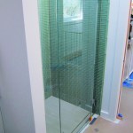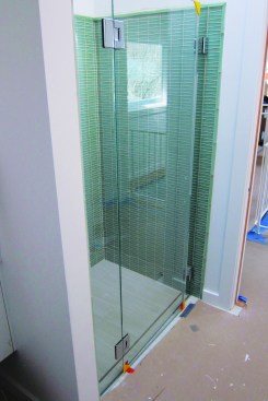 Glass enclosure. With the tile work complete, our glazing sub, Orny Beltrame, of The Glass House, made laser-guided measurements of the two showers. From these, he cut two doors and side panels in 3/8-inch-thick glass, then shipped the pieces out for tempering. This all required about a four-week lead time.