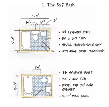 The second 5×7 bath (Figure 1, bottom, above ) offers a little more room for a sink or 24-inch vanity, but at the expense of space in front of the toilet. Also, the largest door you can fit in this plan is a 2′-4″. The only place to grab some storage space in these baths is over the toilet, using open shelves or a mirrored upper cabinet.