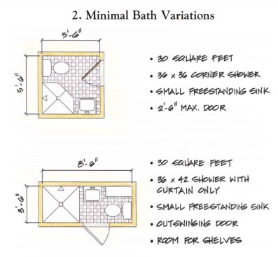 There are two versions of the minimum bath (see Figure 1, top, above). Each takes up 35 or 40 square feet (not counting the wall thickness). In the first version, the tub, toilet, and wallhung sink are all in line. The door is shown on the end of the rectangle, but it can just as easily be put on the side. The plan offers plenty of room in front of the toilet and sink, but the sink itself is small and a cabinet surround just makes the room feel smaller. The rectangular shape of the room and the optional door location make this bath easy to fit into many floor plans.
