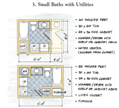 Lengthening the room stretches the vanity so that it can double as a folding table for laundry, or you can add a second sink. The opposite wall has space for a floor-to-ceiling linen closet. The other bath/utility core design (Figure 3, bottom, above) has washer/dryer, water heater, and furnace as well as a full bath with linen closet, all tucked into 82 square feet. Cabinets above the washer/dryer and shelves over the toilet add even more storage.