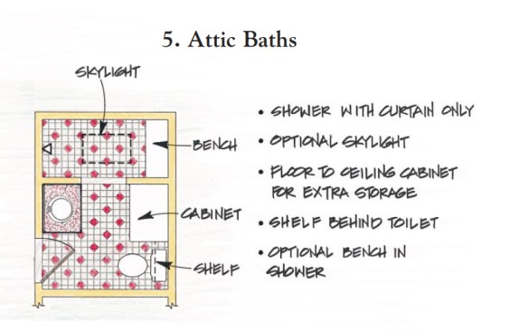 Cost-conscious homeowners are always looking for opportunities to use attic spaces, so I’ve included a couple of second-story or attic baths (Figure 5 , below). These are especially challenging because a third dimension — height — further constrains movement in the room.
