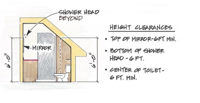 The good news is that there’s only one number you need to remember: 6 feet. The top of a mirror should be a minimum of 6 feet, the lowest wall in a shower should be 6 feet (unless you provide an operable skylight like we did in one house), and the floor-to-ceiling height above the midpoint of the toilet must be at least 6 feet (for reasons obvious to tall men).