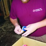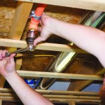 To make a CPVC pipe joint, both of the pieces to be attached need to be smeared with the solvent adhesive. Above, the installer applies a medium-thick coat of adhesive to the inside of the fittings.