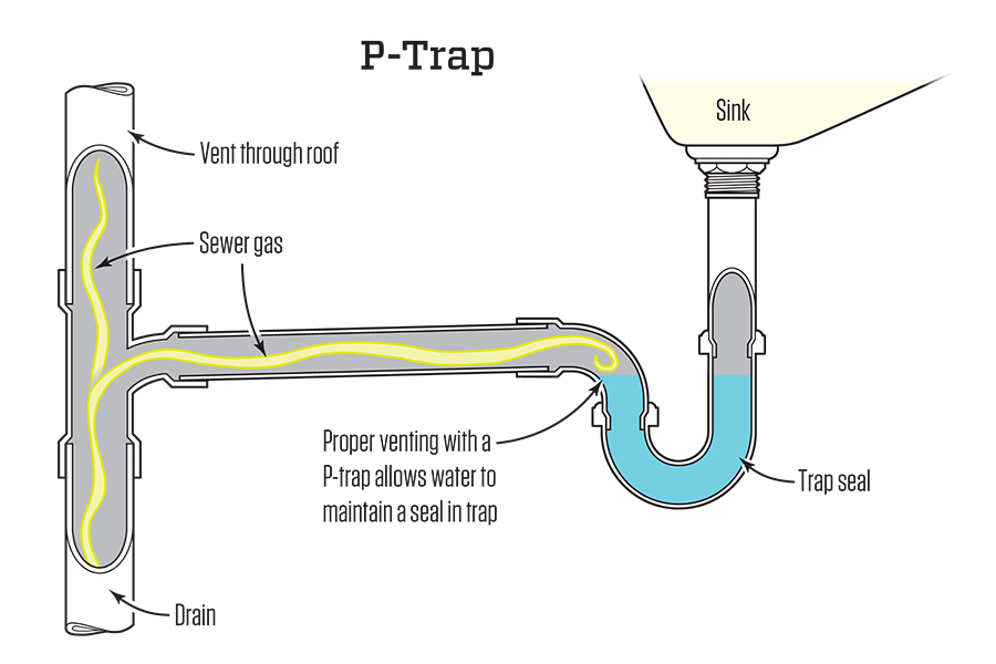 The water in a plumbing trap creates a seal to keep out sewer gases. S-traps are not allowed because they can create a siphon that leaves that seal partially open. A P-trap works with a vent to equalize air pressure and allow the trap to remain full of water.