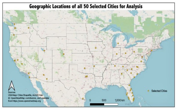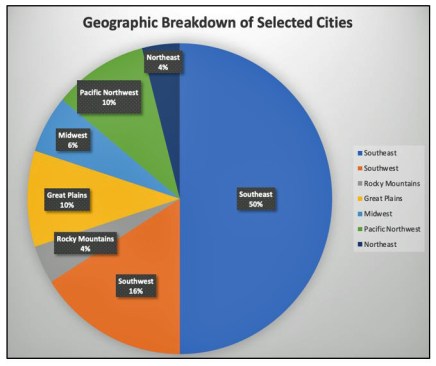 AWE collected data related to water connection fees and reoccurring water and sewer service charges by meter size for 50 of the fastest growing metro areas in the United States. Figures 1 (left) and 2 (below) show the geographic location and regional breakdown of the cities selected for the study. The purpose was to build a dataset that would provide information about the difference in connection fees and reoccurring charges by water meter size, and the potential cost savings that are available due to the emergence of an updated pipe sizing methodology, the Water Demand Calculator.