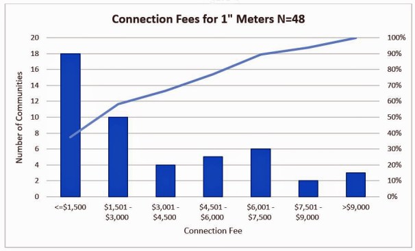 The histogram in Figure 3 (belowP shows the distribution of connection fees for 1-inch meters only. The data shows that over 60 percent of 1-inch meter connection fees exceed $1,500 and over 40 percent exceed $3,000. Thus, the majority of single-family homes will realize significant connection fees cost reductions in addition to the material and labor savings detailed in the Stantec report shown on page 3.
