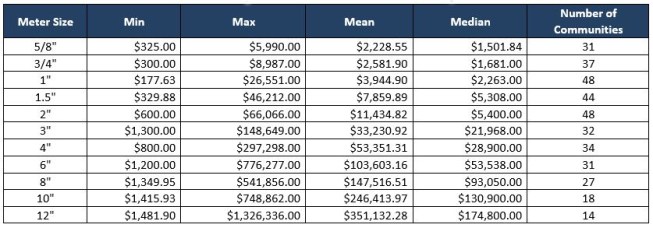As shown in Table 3 (below), the research found extensive variability of connection fees across the country. The cost of a connection fee at a certain meter size can differ by mere tens of dollars up to hundreds of thousands of dollars. For example, the connection fee for a 4-inch meter in Spokane, WA is $9,857 while in nearby Portland, OR the connection fee for the same meter size is $85,311.4