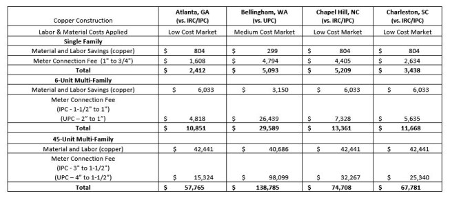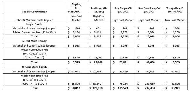 Table 2 (below) shows the total material and labor cost savings of applying the WDC based on a U.S. dollar / percentage basis as compared to applying the UPC, IPC, or IRC. These values represent the cost savings that can be expected when applying the Water Demand Calculator on one single-family home or multi-family building.