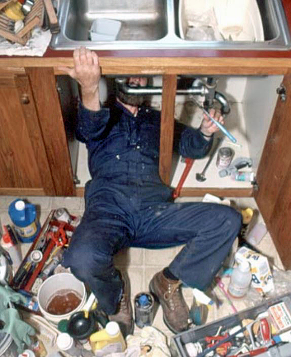 Leaks under the kitchen sink. Kitchen sink drain lines are arguably the most ill-conceived systems in American plumbing — they are simply designed to leak. Everything is held together with slip joints — those hand-tightened connections that come loose every time they’re bumped. And since all the traps and drain lines are placed right up front, you can’t help but bump them every time you reach into the cabinet. I would wager that at least 60% of those reading this article currently have a leak under the kitchen sink.
