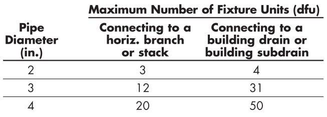 • Drains connect at the same level, or at different levels if sized according to the table in Minimum Common Vent Sizes, below.