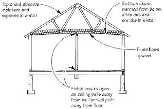 A.David Utterback responds: If your floor is framed with green lumber, shrinkage of the floor joists could contribute to the problem you describe. But the primary cause is probably truss uplift. Lower truss chords that touch the warm ceiling dry out and shrink during the heating season, while the cold upper chords gain moisture and expand. The whole truss then curves like a bow, rising at the center. If the truss is nailed to the wall, it pulls the wall with it. The moving truss can also create drywall finish cracks in the corners where walls and ceilings meet (see illustration, below).