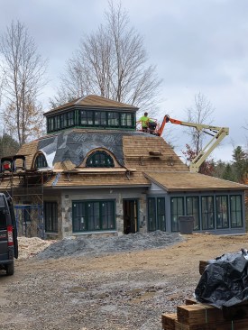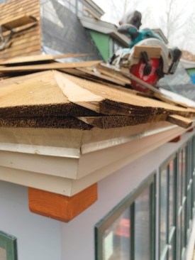 On this project, the red-cedar hip cap shingles were custom-fabricated off site to match the specific roof pitch where they would be used.