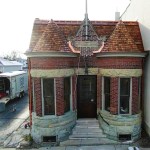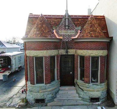 Most of the building’s roof is a single plane that slopes to the back from a steep, Mansard-style front. Twin turret roofs grow out of the base of this steep roof plane and tie back to it higher up with short, level ridges at their peaks. Centrally located between the turrets is a small masonry dormer with a brick gable end that serves as the base for a wood flag pole and a limestone plaque identifying the law firm that originally occupied the building.