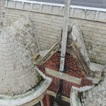 Copper work. The first line of defense over the underlying protective layers was thousands of dollars’ worth of copper flashing. We had to get approval from Indiana Landmarks to use copper because the original flashings were lead or terne metal. All the new copper work, including the turret valleys, downspouts, circular gutters, and ribbed ridge capping, was fabricated off site. The main work for our crew was templating all the sections with 1/2‑inch plywood. Once fabricated, the sections were soldered on site. The crickets behind the central gable were lined with copper that was soldered to the valleys and two extended spouts, creating a watertight assembly that could drain well. Beneath the spouts, we completed the copper work with step flashings and counterflashing that tied in with the wide copper gutters encircling the turrets.